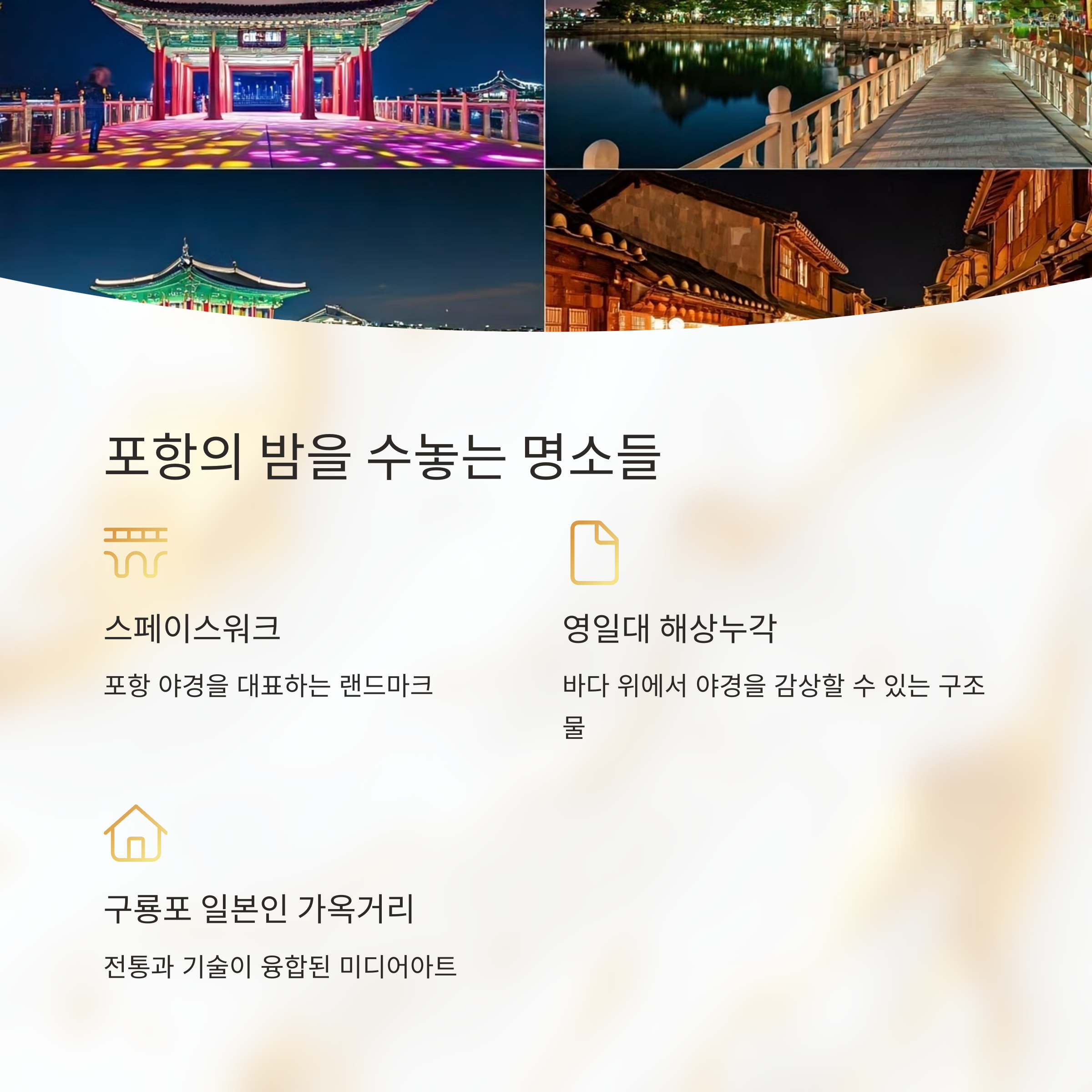 야간관광상품 구성에는 포항의 대표적인 야경 콘텐츠가 필수적으로 포함되어야 합니다. 아래의 콘텐츠 중 1개 이상을 활용해야 하며, 조합에 따라 보다 매력적인 패키지 구성이 가능합니다.