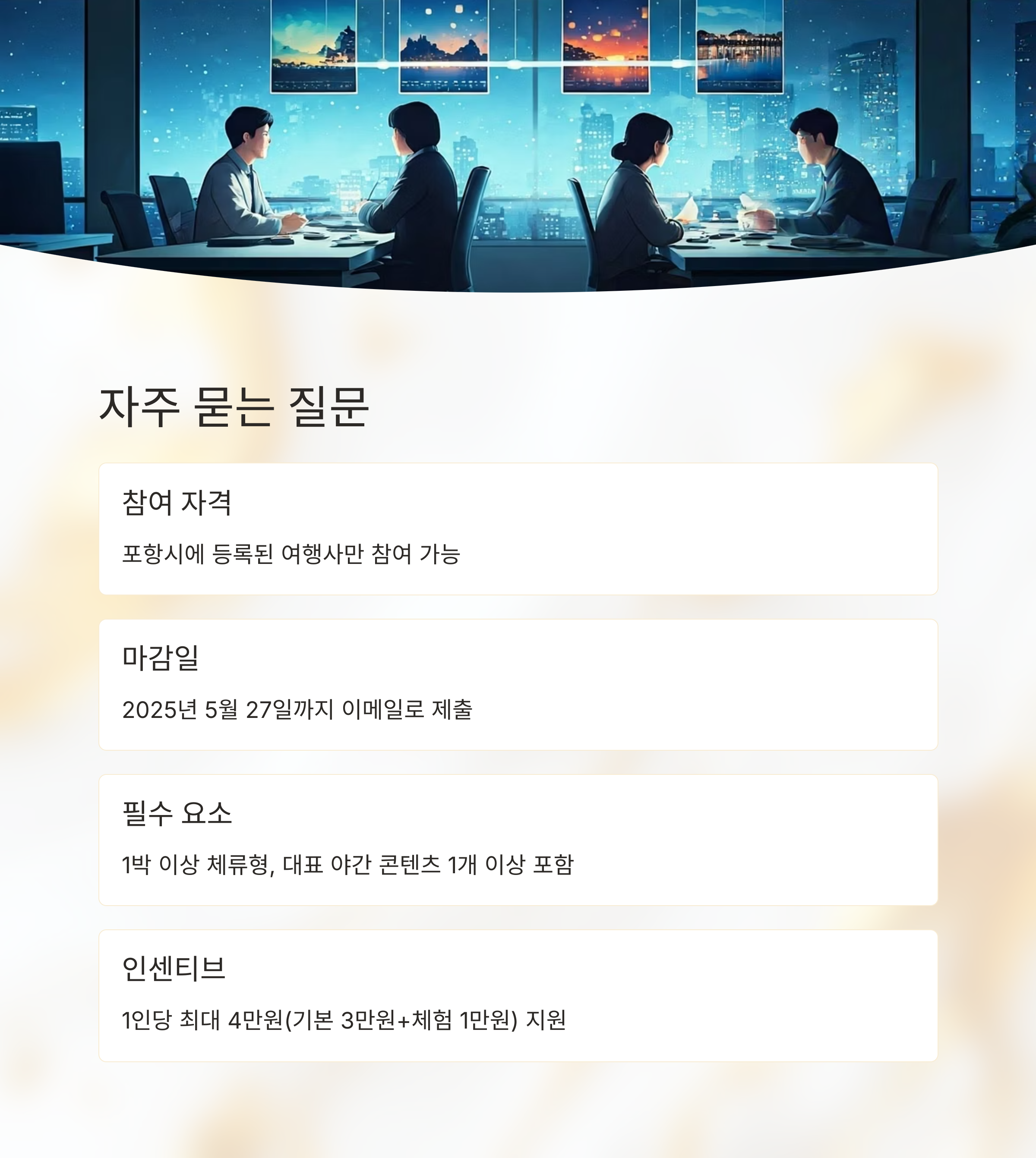 1박 이상의 체류형 여행 상품이어야 하며, 포항의 대표 야간 콘텐츠 중 최소 1개 이상을 포함해야 합니다.
