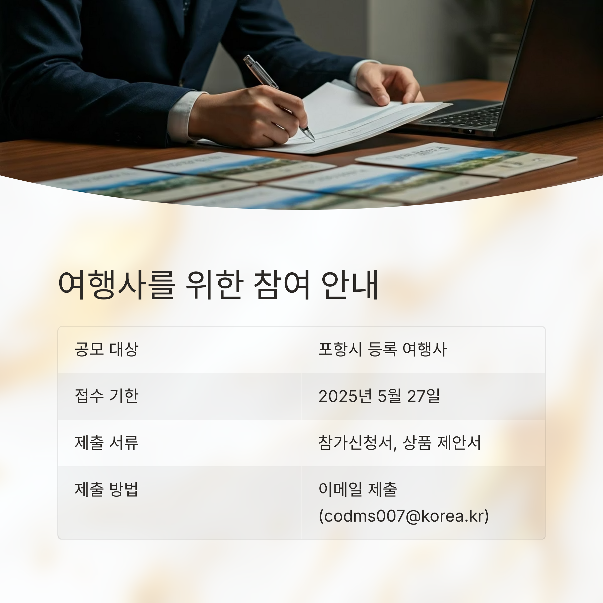 이번 공모는 포항시에 등록된 여행사를 대상으로 진행됩니다. 2025년 5월 27일까지 신청이 가능하며, 이메일 제출 방식으로 간단하지만 창의적인 제안이 요구됩니다.