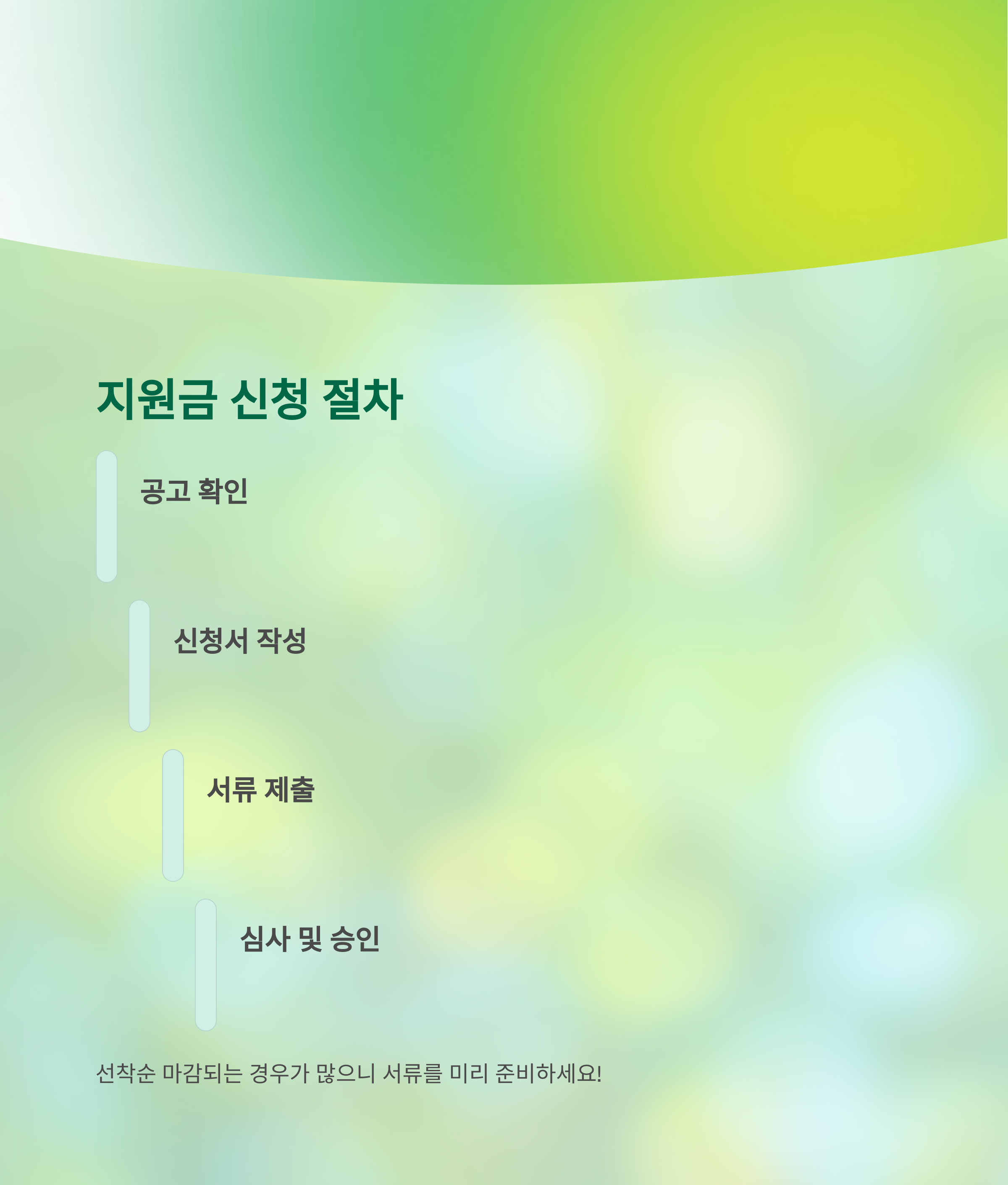 먼저 공고 확인 → 신청서 작성 → 서류 제출 → 심사 및 평가 → 승인 → 지급 순이며,