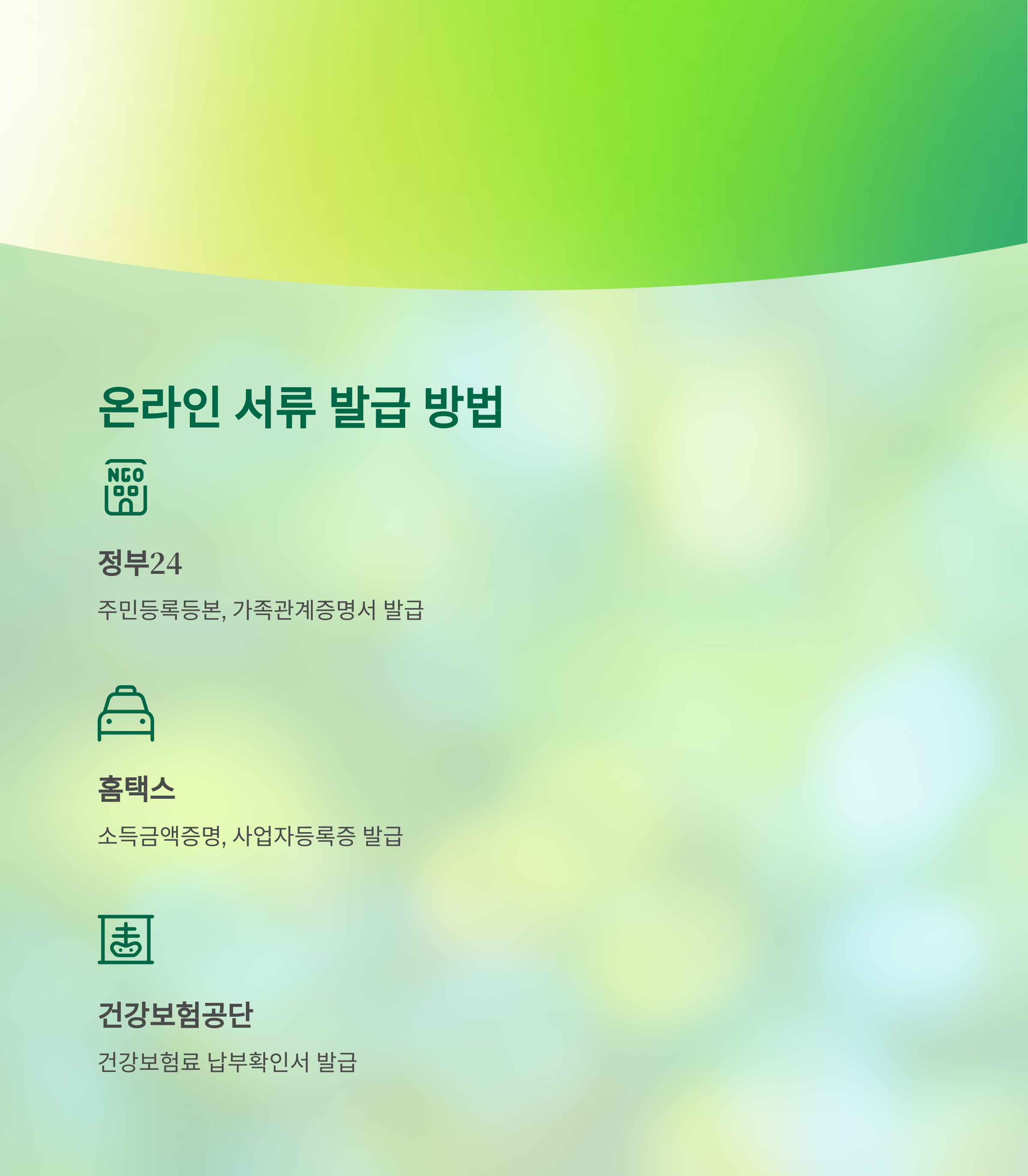대부분의 정부 제출 서류는 온라인으로 손쉽게 발급이 가능합니다.