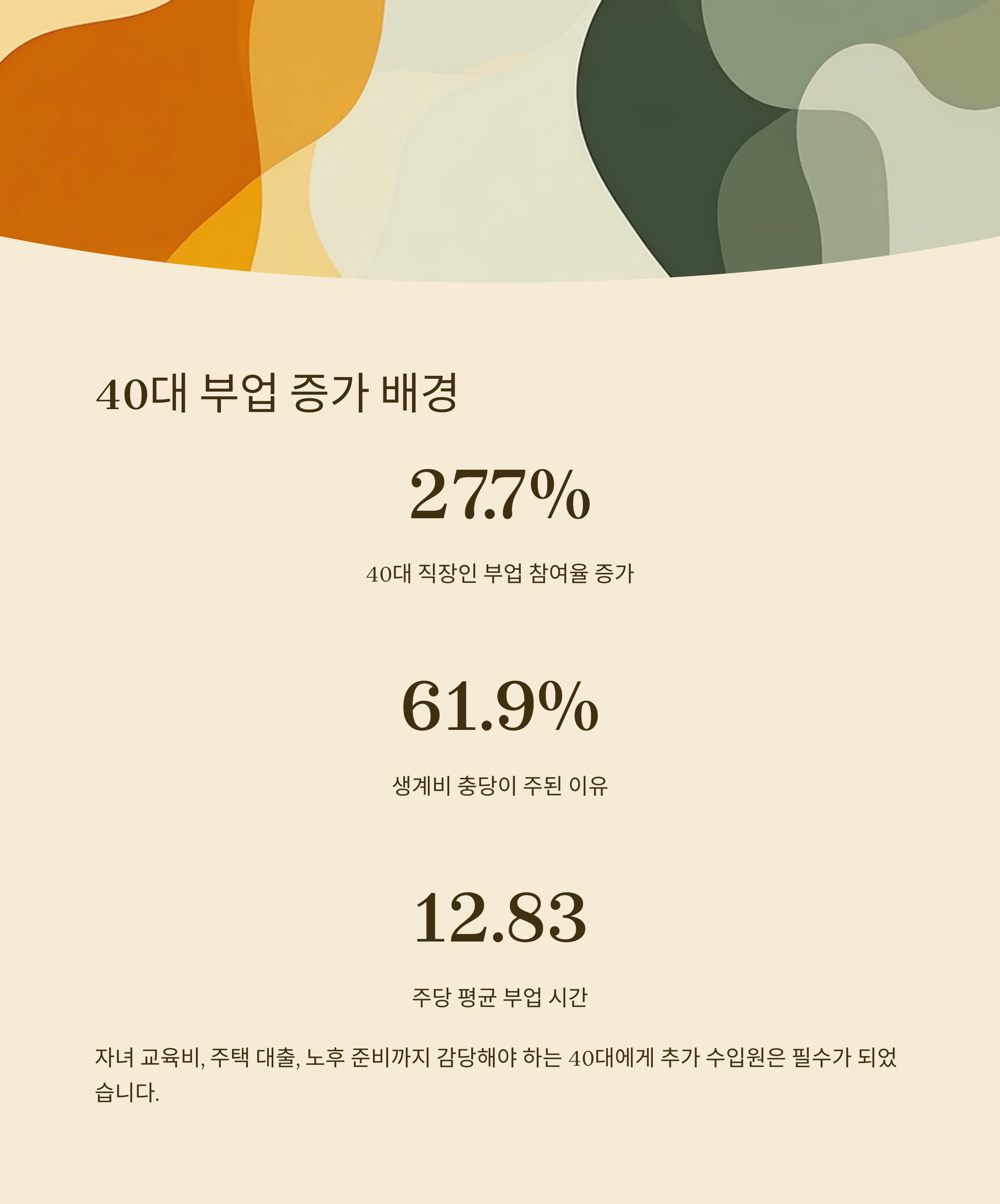 2025년 1분기, 40대 직장인의 부업 참여율이 전년 대비 27.7%나 증가했어요. 이 수치는 단순한 통계를 넘어서, 현실 경제의 압박이 얼마나 큰지를 보여주는 지표라고 할 수 있습니다. 특히 자녀 교육비, 주택 대출, 노후 준비까지 감당해야 하는 40대에게 추가 수입원은 더 이상 선택이 아닌 필수가 되었죠. 전체 부업자 중 40대 비율은 계속 증가하는 중이고, 그중 61.9%는 생계비 충당이 주된 이유라고 합니다.