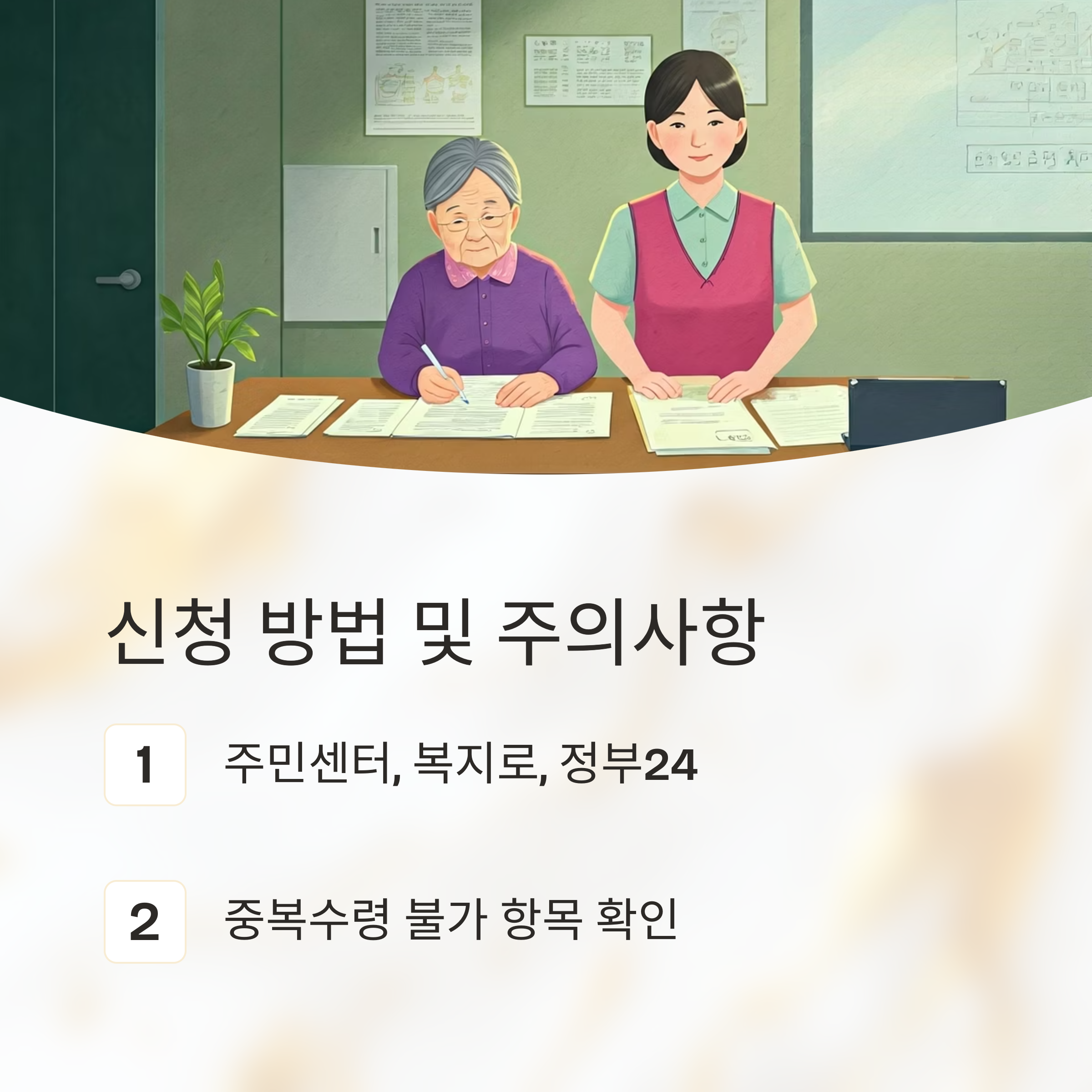 신청은 주소지 관할 주민센터나 복지상담센터(129)를 통해 가능하며,