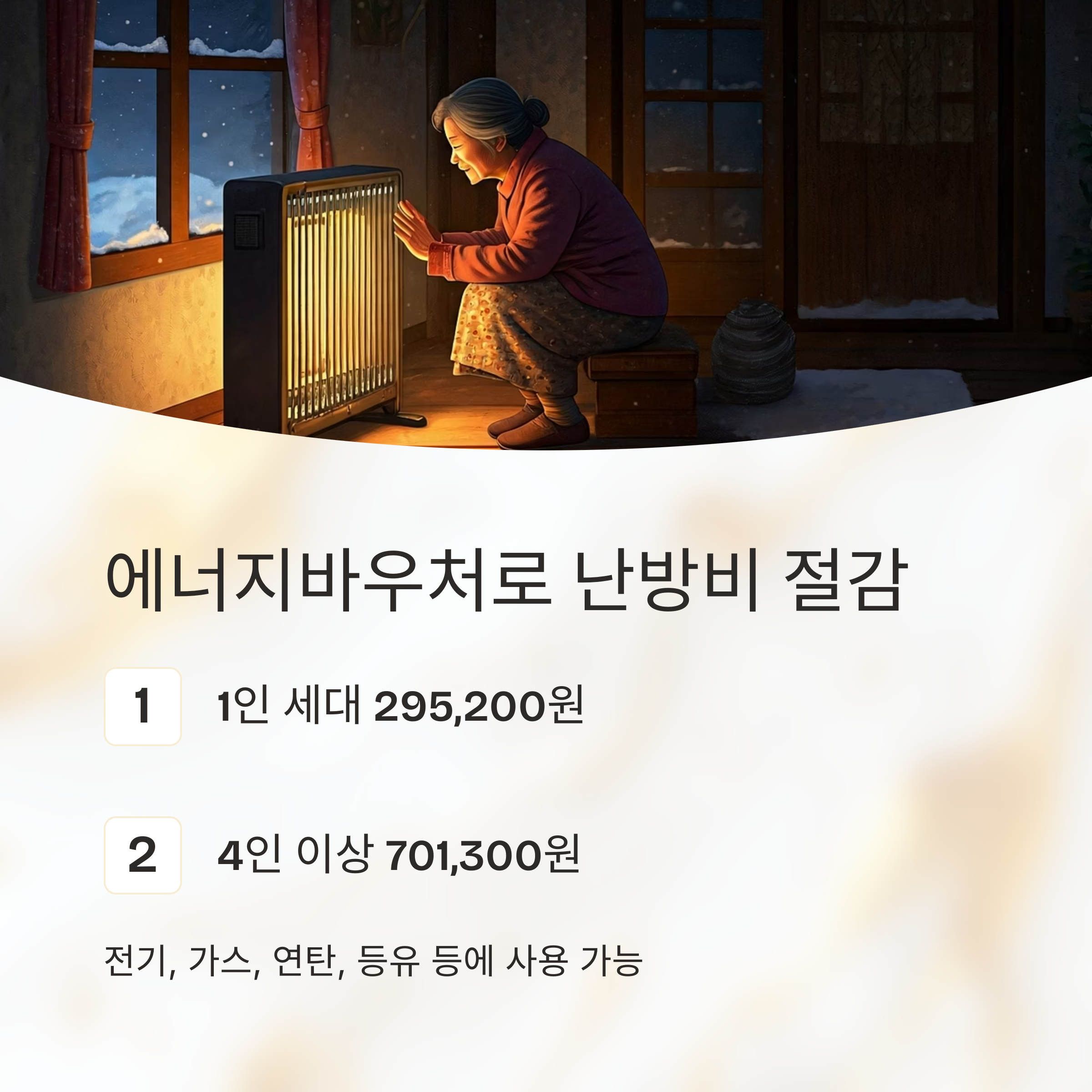 지원을 받을 수 있습니다. 해당 금액은 전기, 도시가스, 연탄, 등유