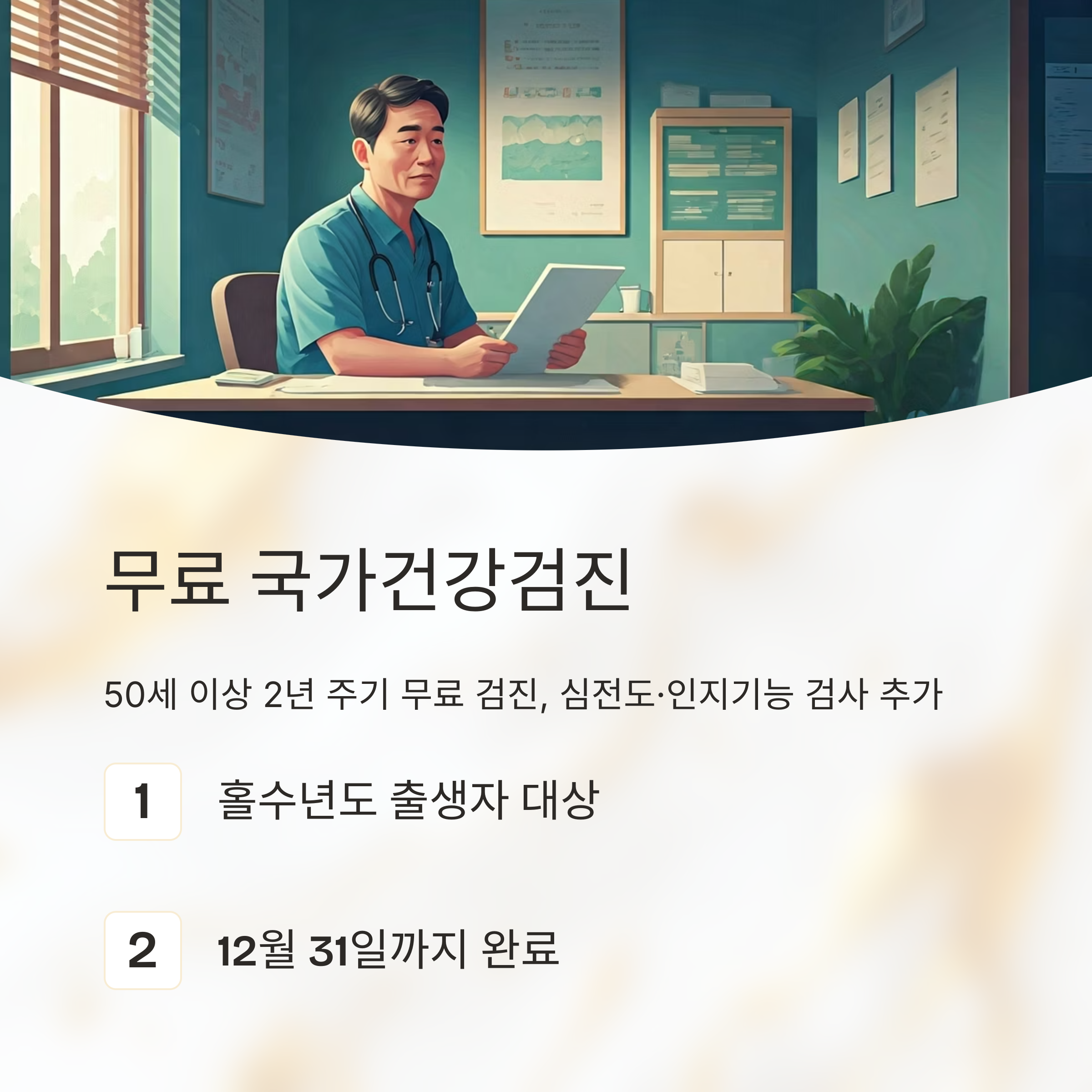 50세 이상은 2년 주기로 국가 건강검진을 무료로 받을 수 있습니다.