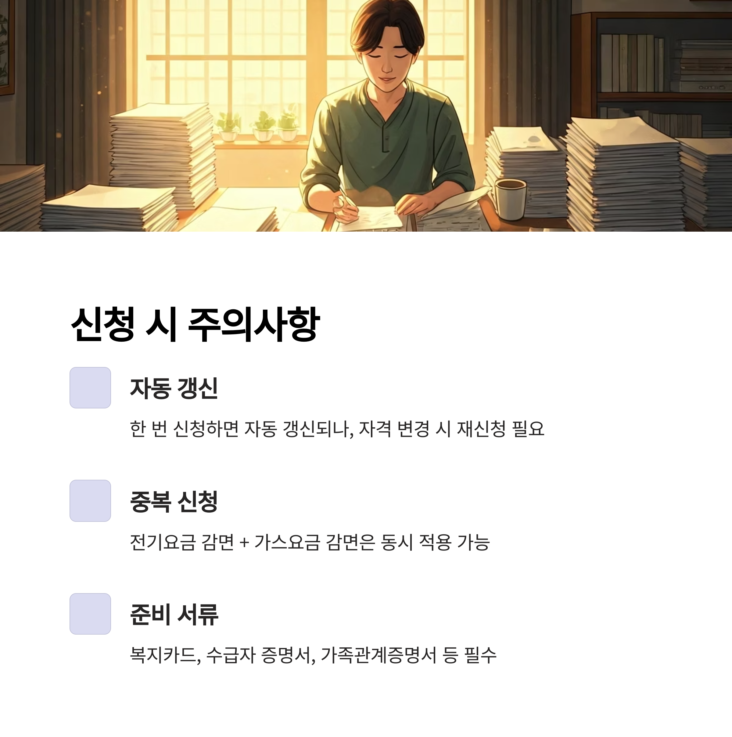 자격 변경 시에는 반드시 재신청이 필요합니다. - 중복 신청 가능: 전기요금 감면 + 가스요금 감면은 동시 적용 가능