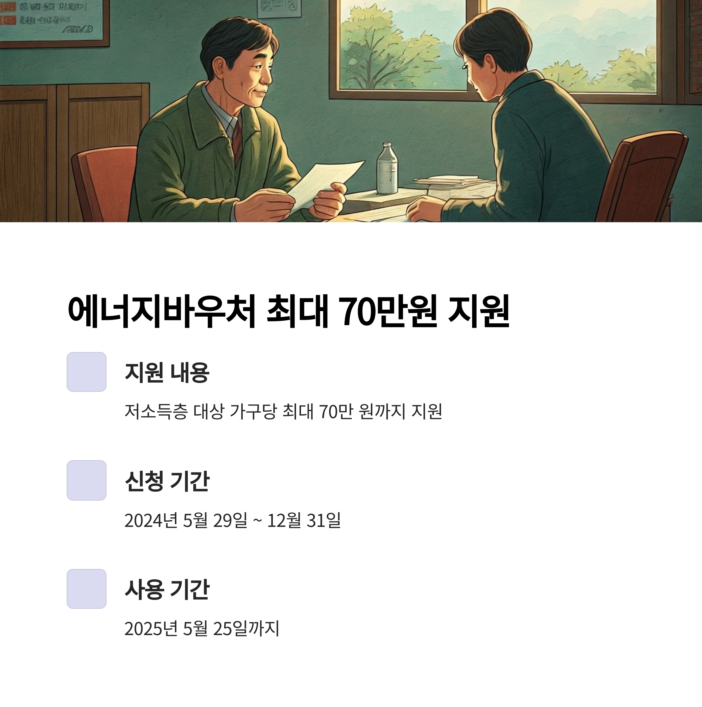 에너지바우처는 저소득층 대상 가구당 최대 70만 원까지 지원하는 제도입니다.