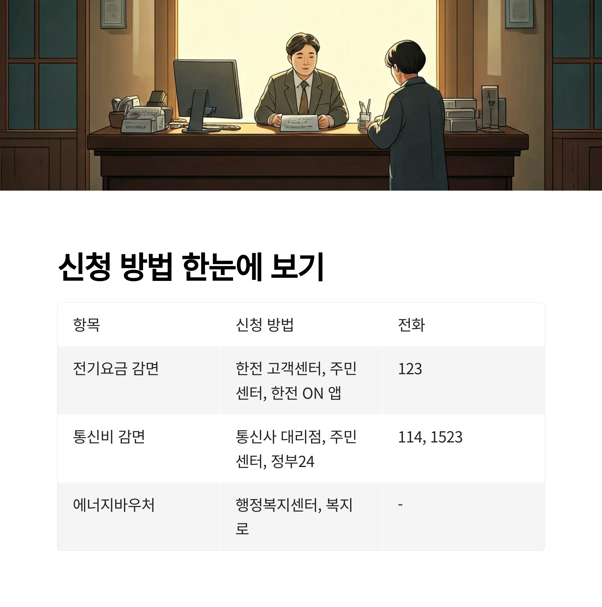 | 통신비 감면 | 통신사 대리점, 주민센터 | 정부24, 복지로 | 114, 1523 |