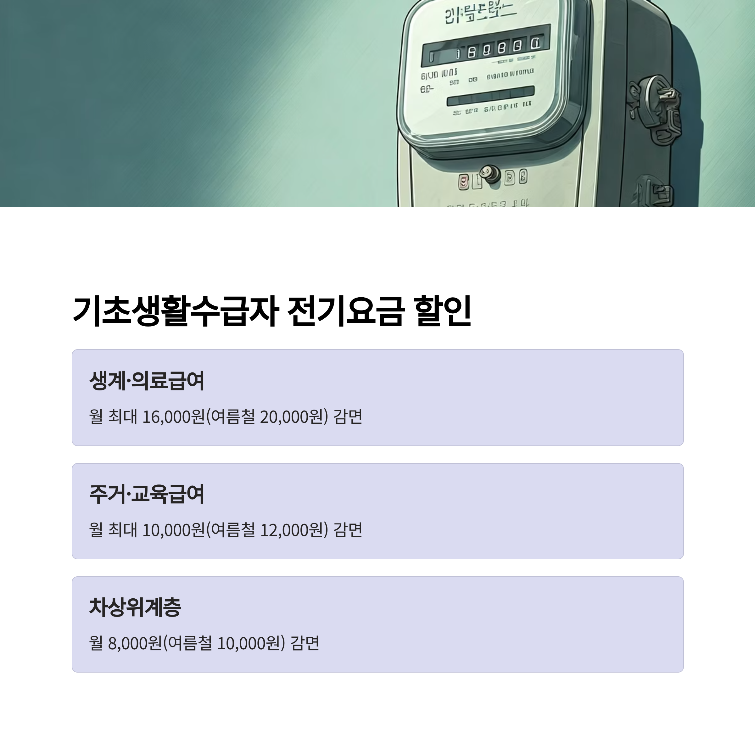 주거·교육급여 수급자는 월 최대 10,000원(여름철 12,000원) 감면받을 수 있습니다.