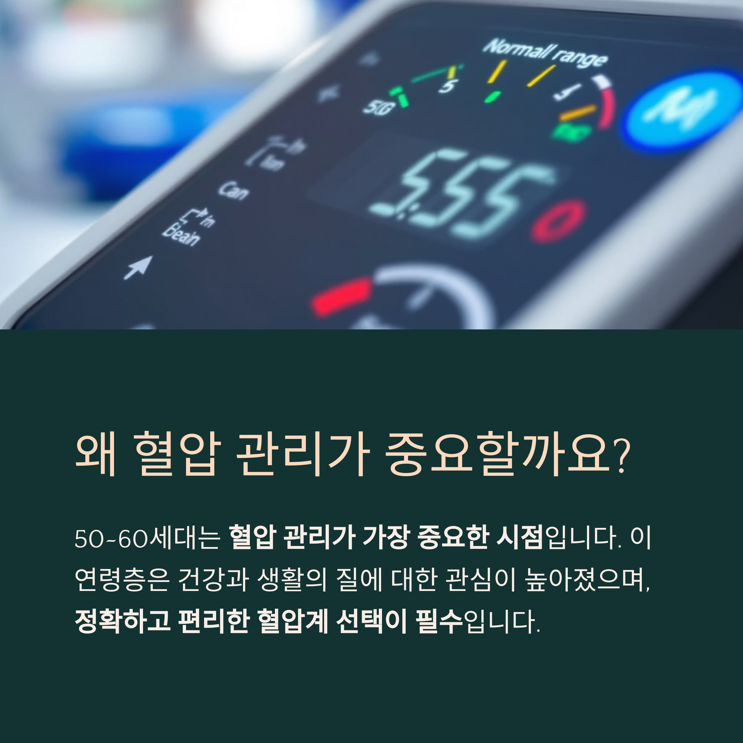 50~60세대는 신체 변화가 빠르게 일어나는 시기이므로, 혈압계를 통한 정기적 건강 관리가 필수입니다.