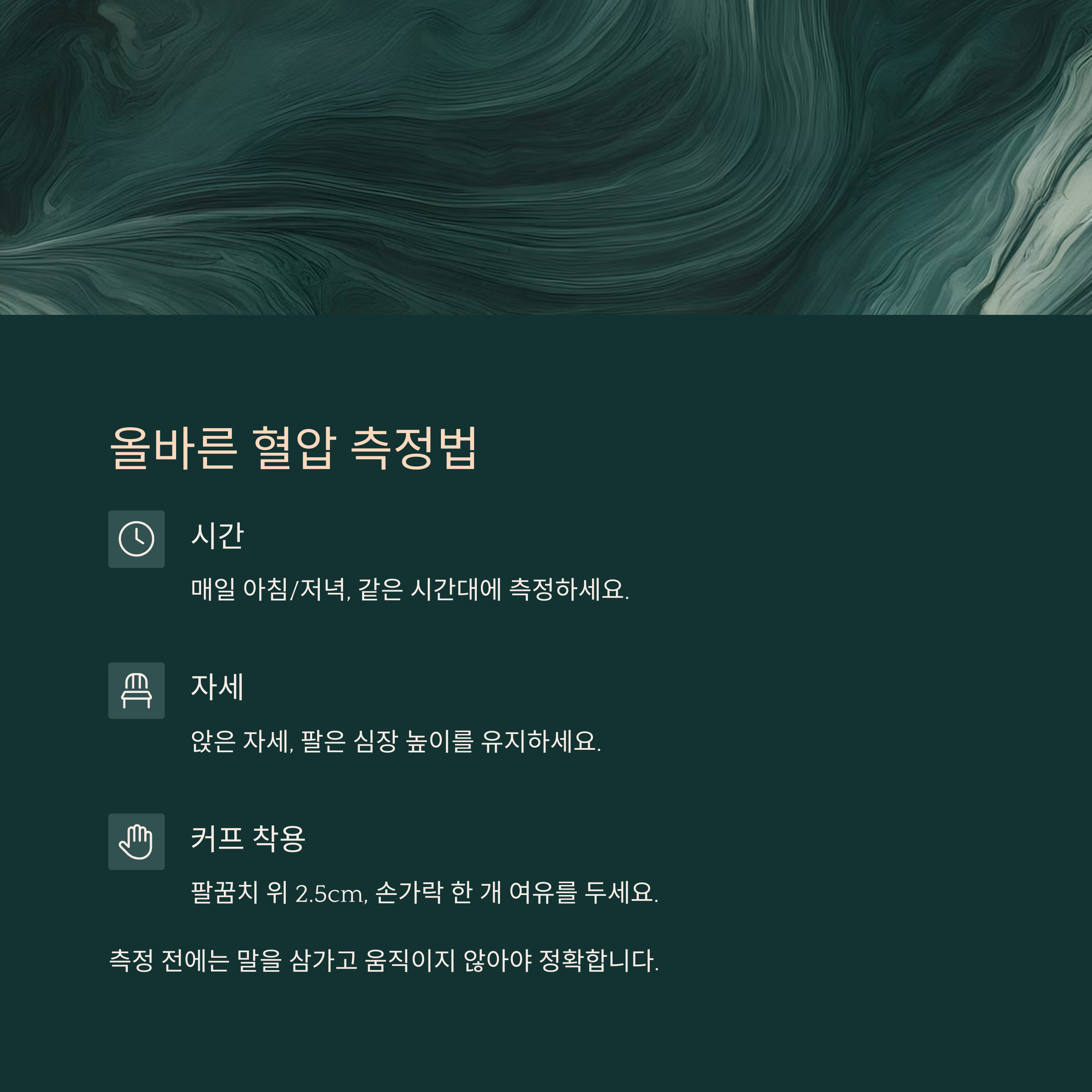 | 측정 전 준비 | 5분 안정, 식후/운동 후 피하기 |