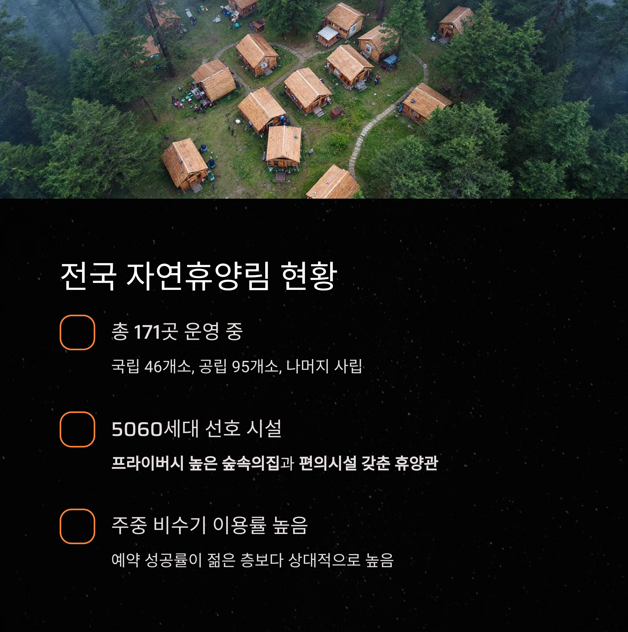 산림청 통계 자료에 따르면 자연휴양림 주요 이용층 중 50~60대가 큰 비중을 차지하며,