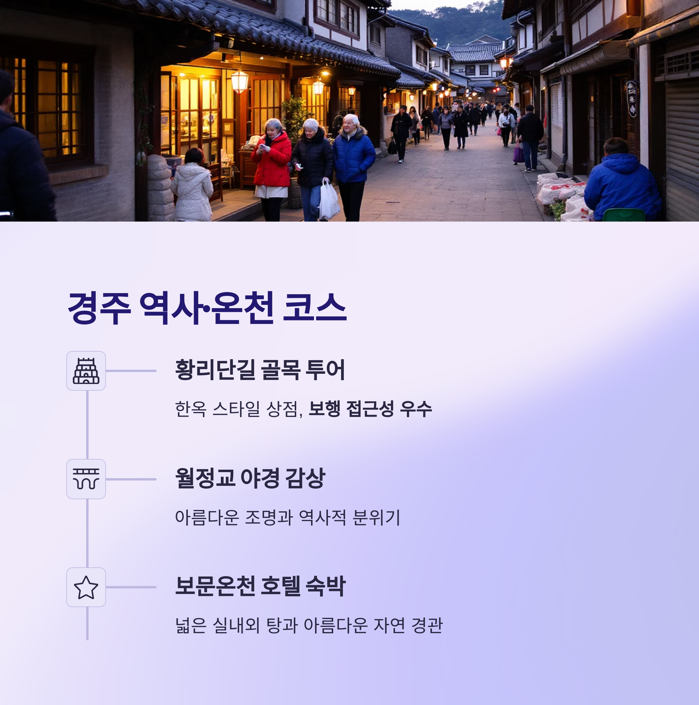 야경이 아름다운 월정교, 보문호수 인근 온천 호텔에서의 숙박까지 경주의 매력을 고루 담은 구성입니다.