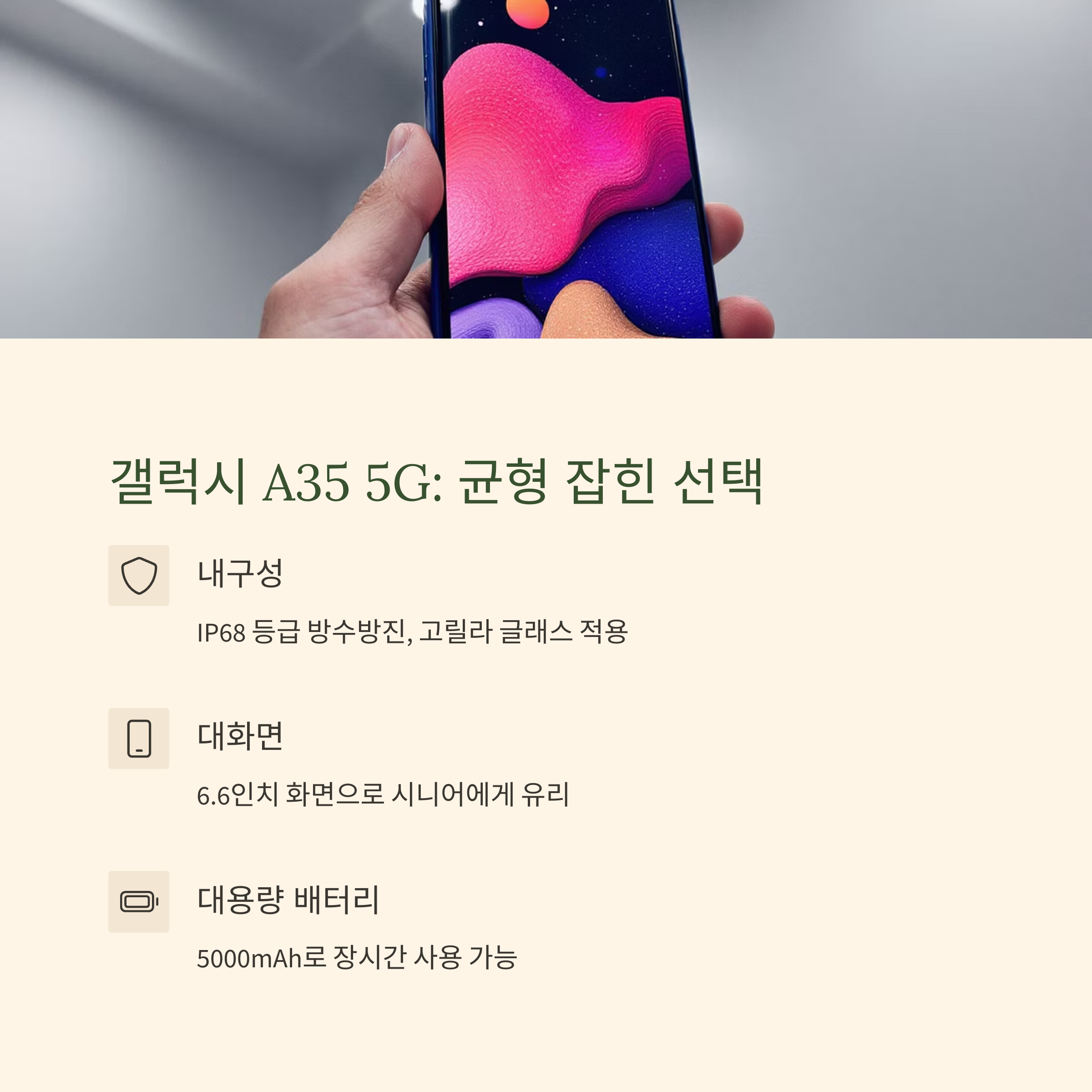 갤럭시 A35 5G는 내구성, 배터리, 화면 크기 모두를 갖춘 균형 잡힌 스마트폰입니다.