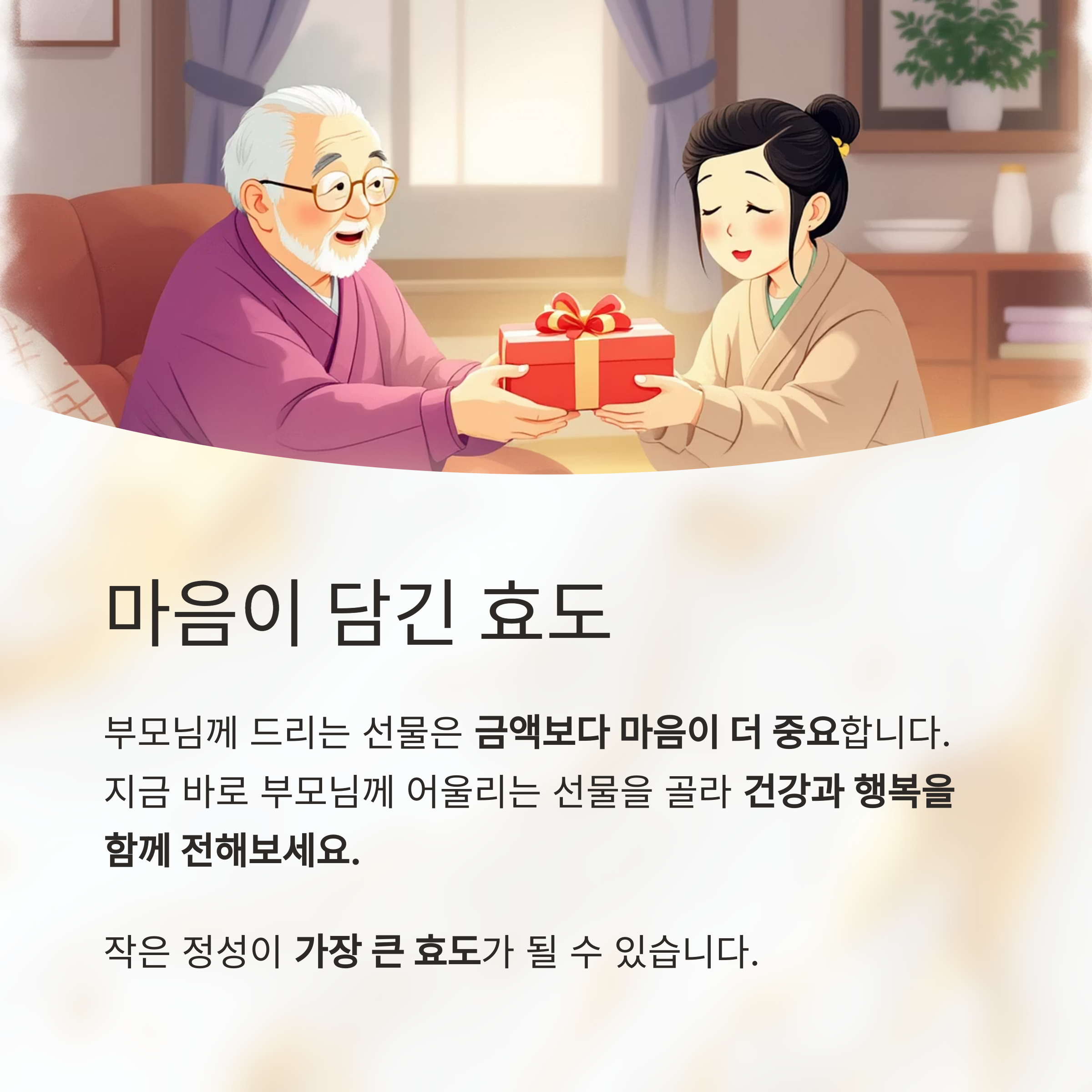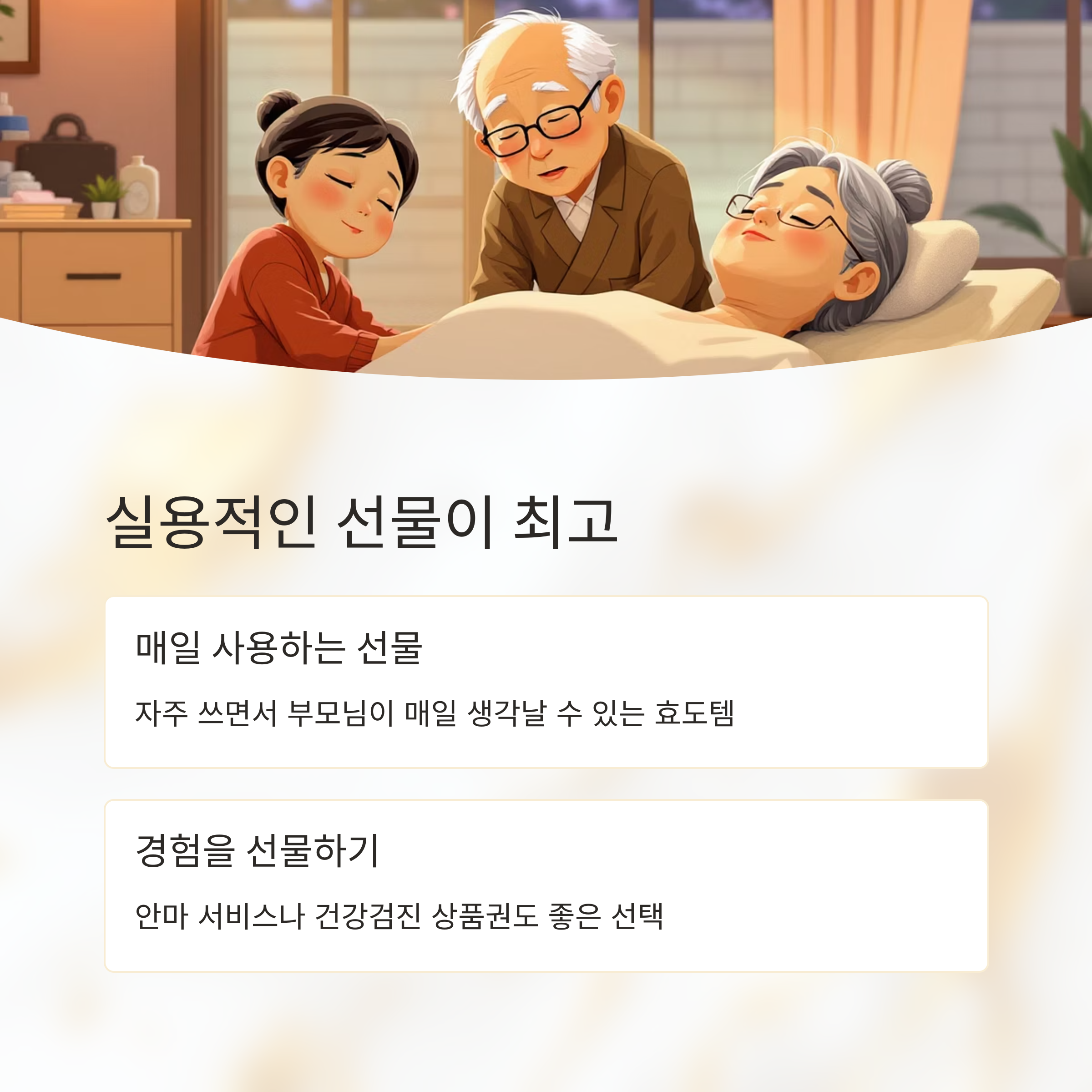 | 10 | 안마 서비스 또는 건강검진 상품권 | 직접 고르는 경험형 선물, 필요한 서비스를 선택할 수 있는 실용적 효도 선물 |