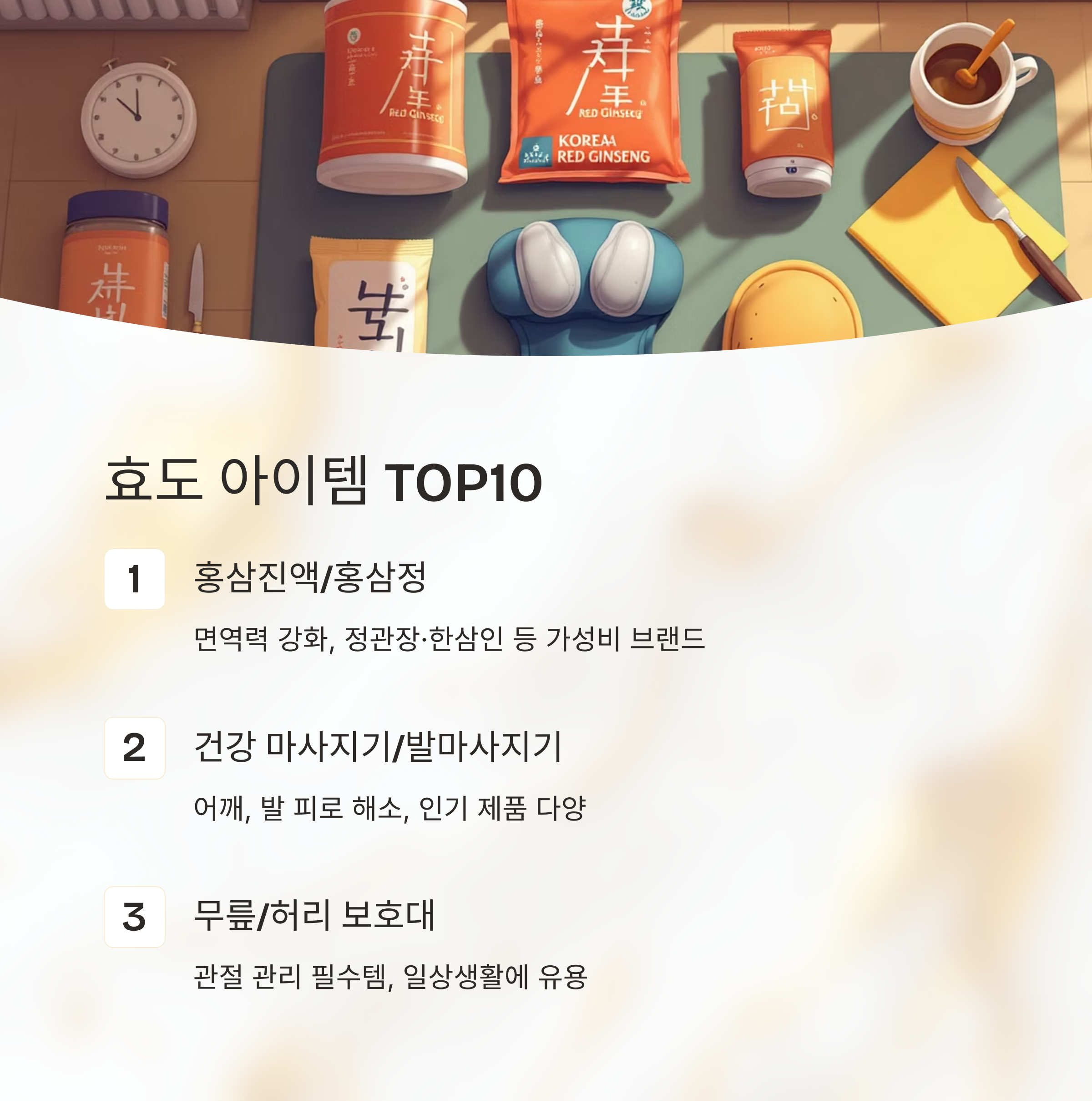 | 3 | 무릎 보호대 / 허리 보호대 | 관절 관리 필수템, 일상생활에 유용 |