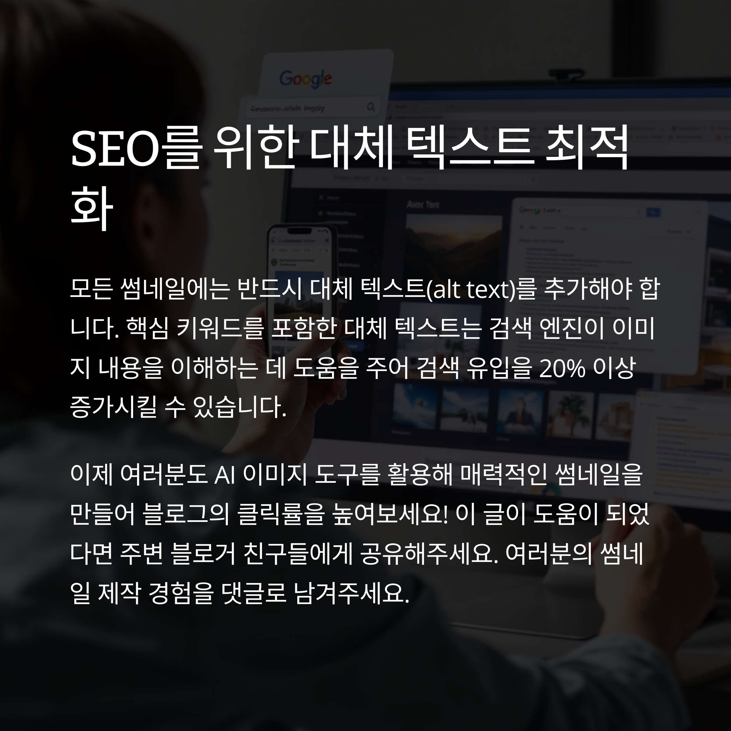 SEO 최적화를 위해 썸네일 이미지에는 반드시 대체 텍스트를 넣어야 해요. 단순히 ‘썸네일 이미지’ 이런 식으로 끝내지 말고, 내용을 반영한 문장을 짧고 구체적으로 적어야 합니다.
