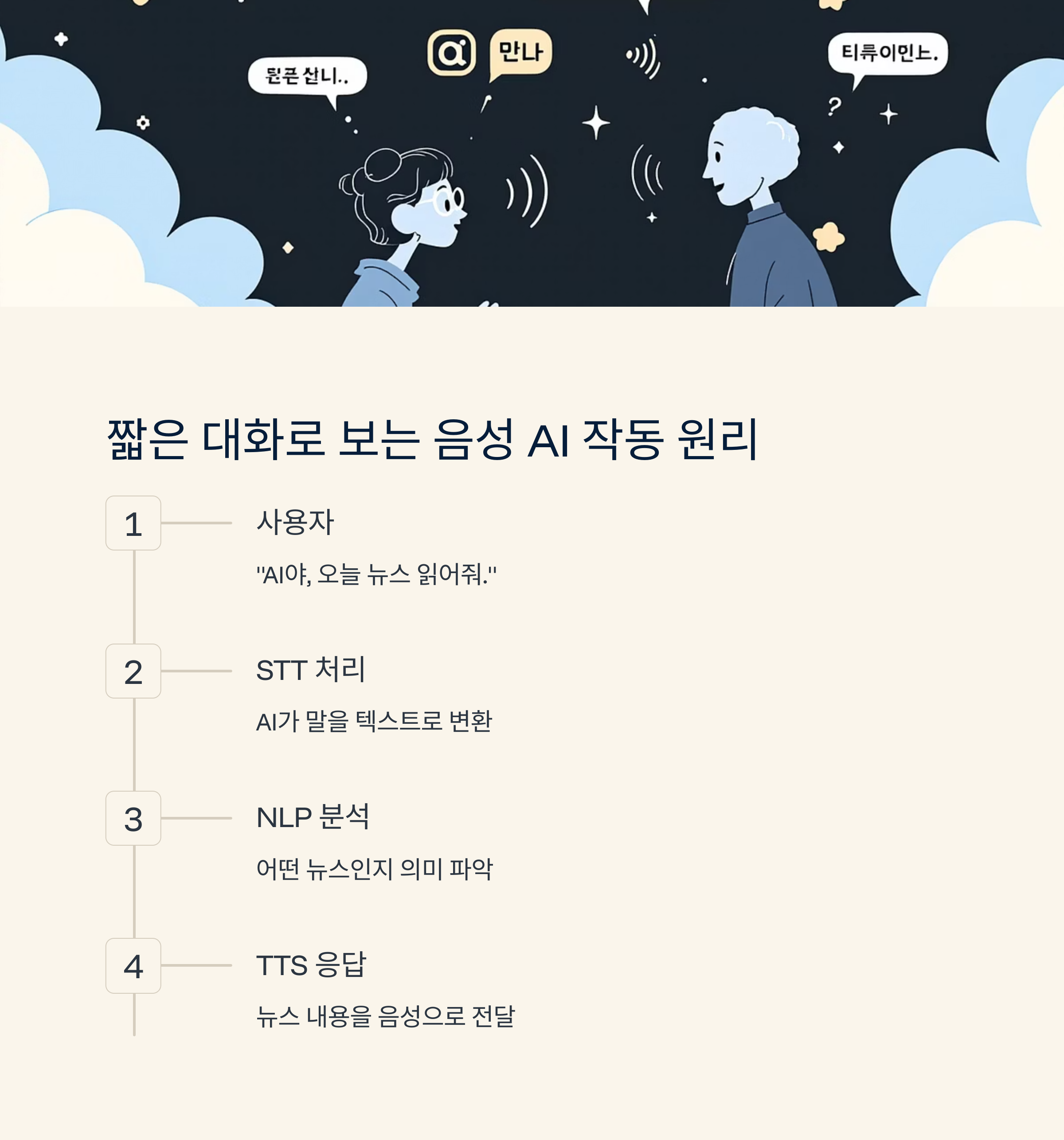 AI가 내용을 파악하고 (자연어 처리) → TTS가 목소리로 알려줍니다.