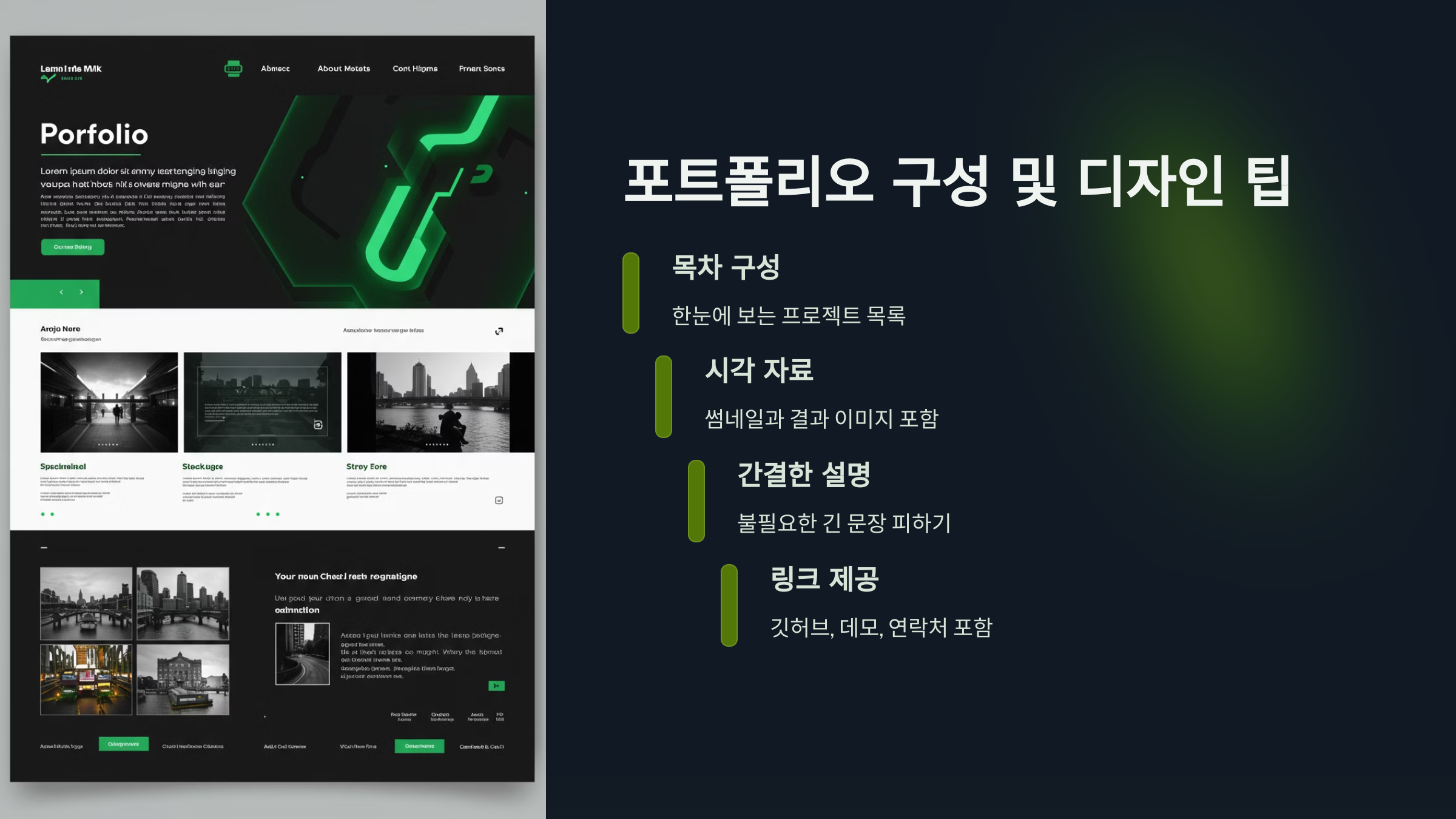 특히, 채용 담당자는 수십 개의 포트폴리오를 검토하기 때문에 빠르게 이해 가능한 구성이 정말 중요해요!