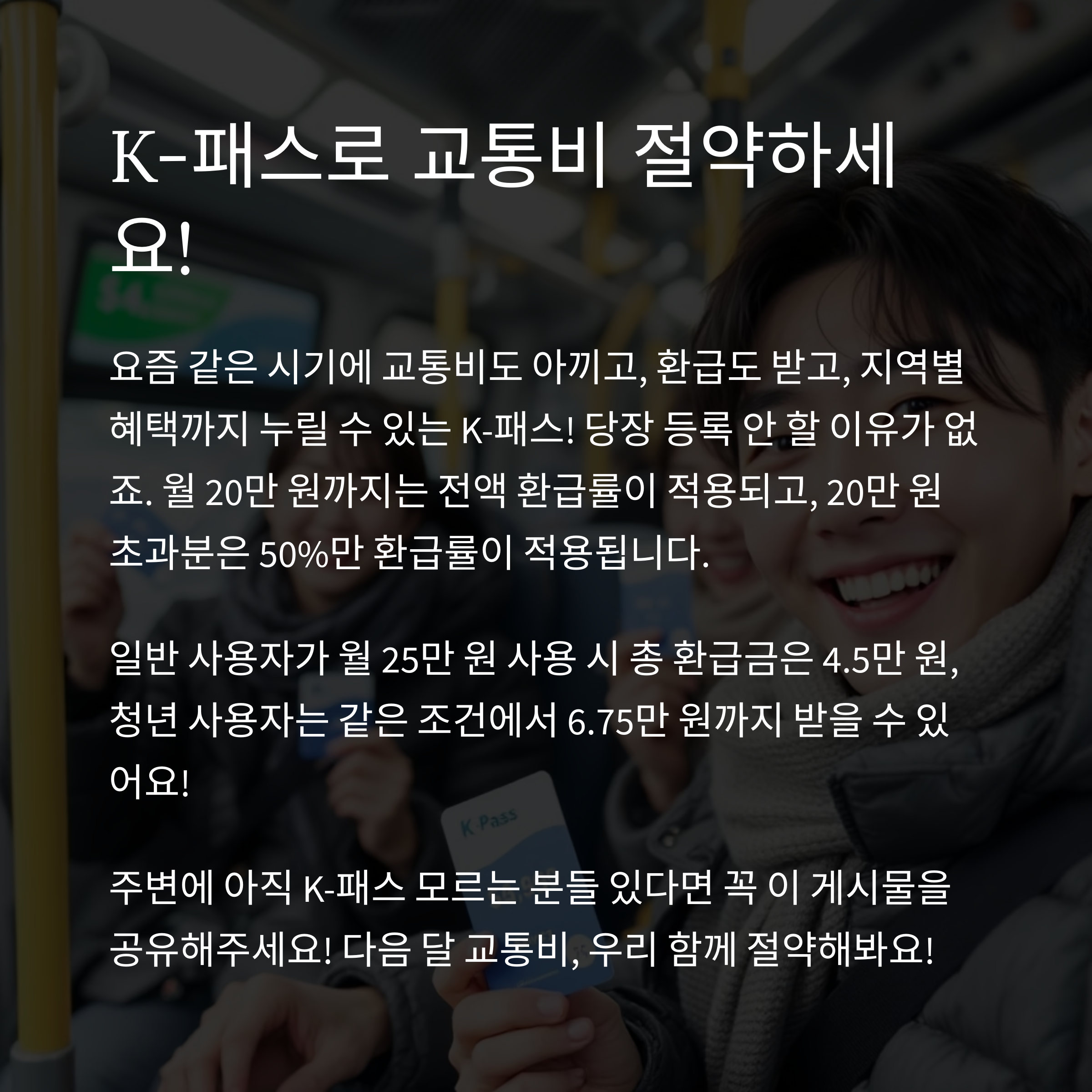 여러분, 이렇게 보면 K-패스 진짜 안 쓰면 손해인 거 보이시죠? 요즘 같은 시기에 교통비도 아끼고, 환급도 받고, 지역별 혜택까지 누릴 수 있다면 당장 등록 안 할 이유가 없잖아요. 혹시라도 주변에 아직 K-패스 모르는 분들 있다면 꼭 공유해 주세요. 나중에 "왜 진작 안 알려줬어!" 소리 듣지 말고요. 다음 달 교통비, 우리 함께 절약해 봐요!