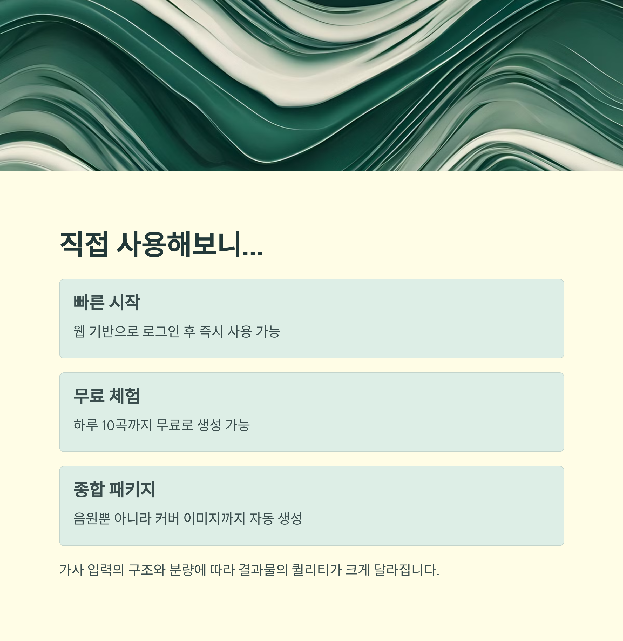 음악 전문 지식이 전혀 없어도, 가사나 간단한 키워드를 입력하면 자동으로 작곡, 편곡, 보컬까지 포함된 완성된 곡을 생성해 줍니다.
