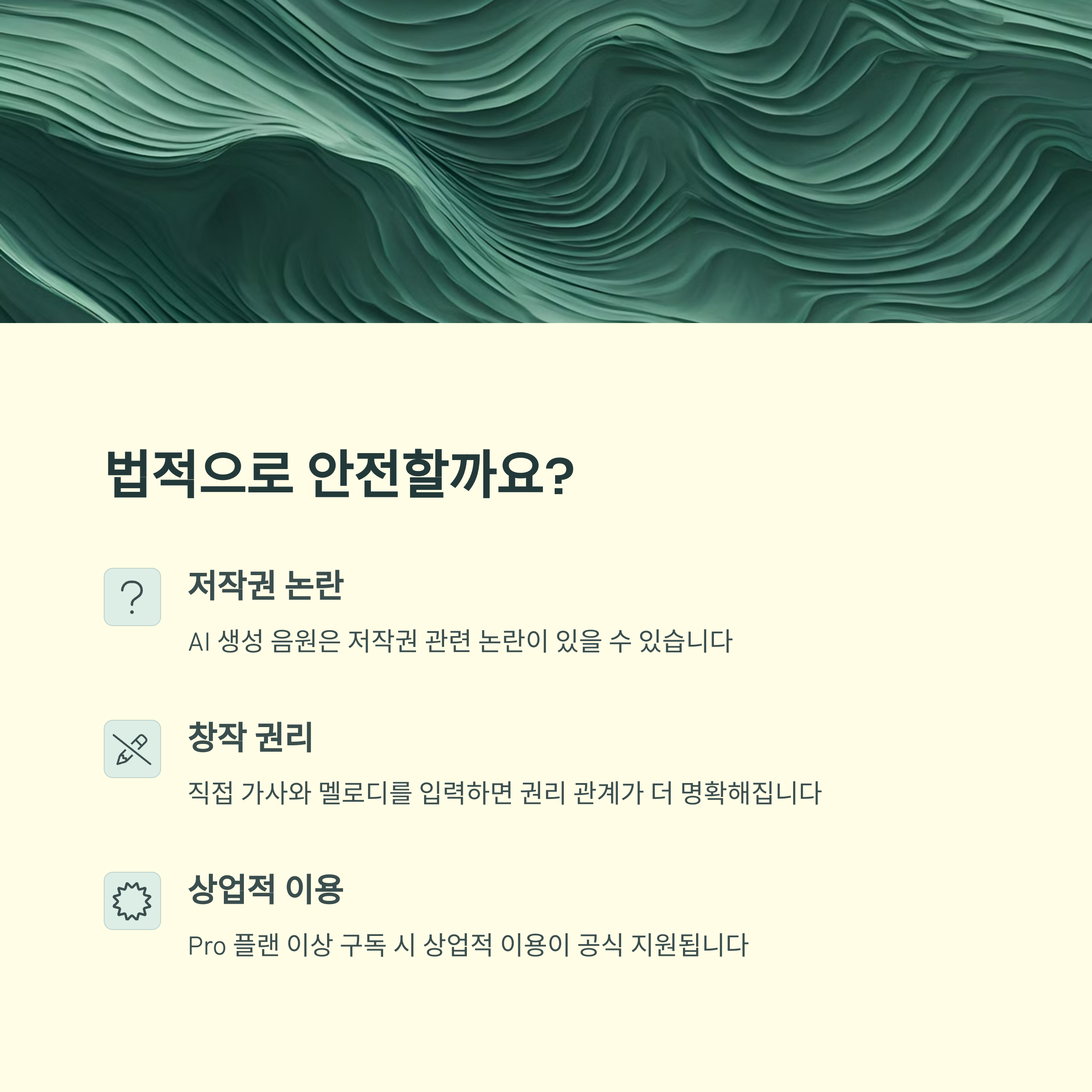 AI가 만든 음악이지만, SUNO에서 만든 곡은 비상업적 용도에 한해 자유롭게 사용할 수 있는 구조입니다.