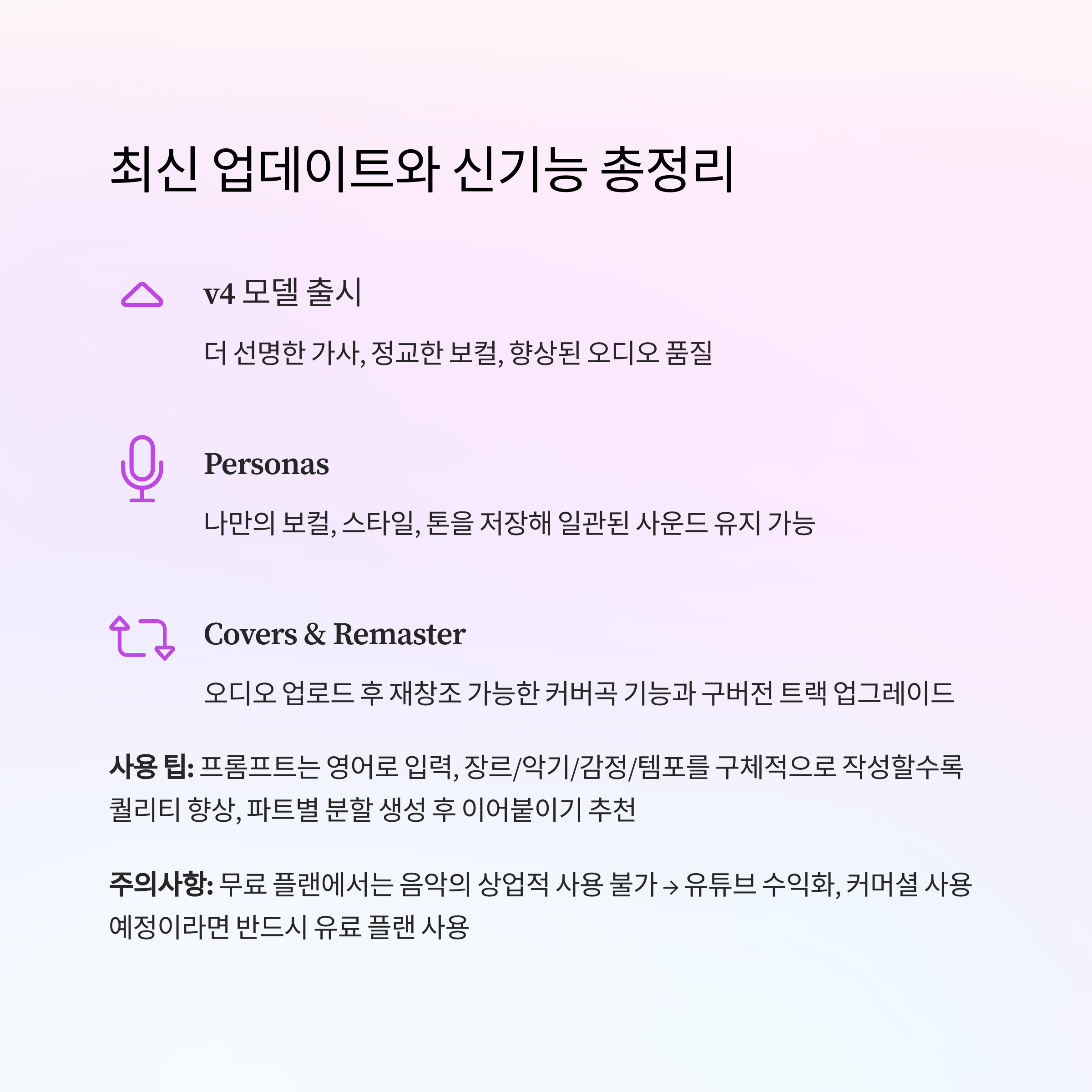 | v4 모델 출시 | 더 선명한 가사, 정교한 보컬, 향상된 오디오 품질 |