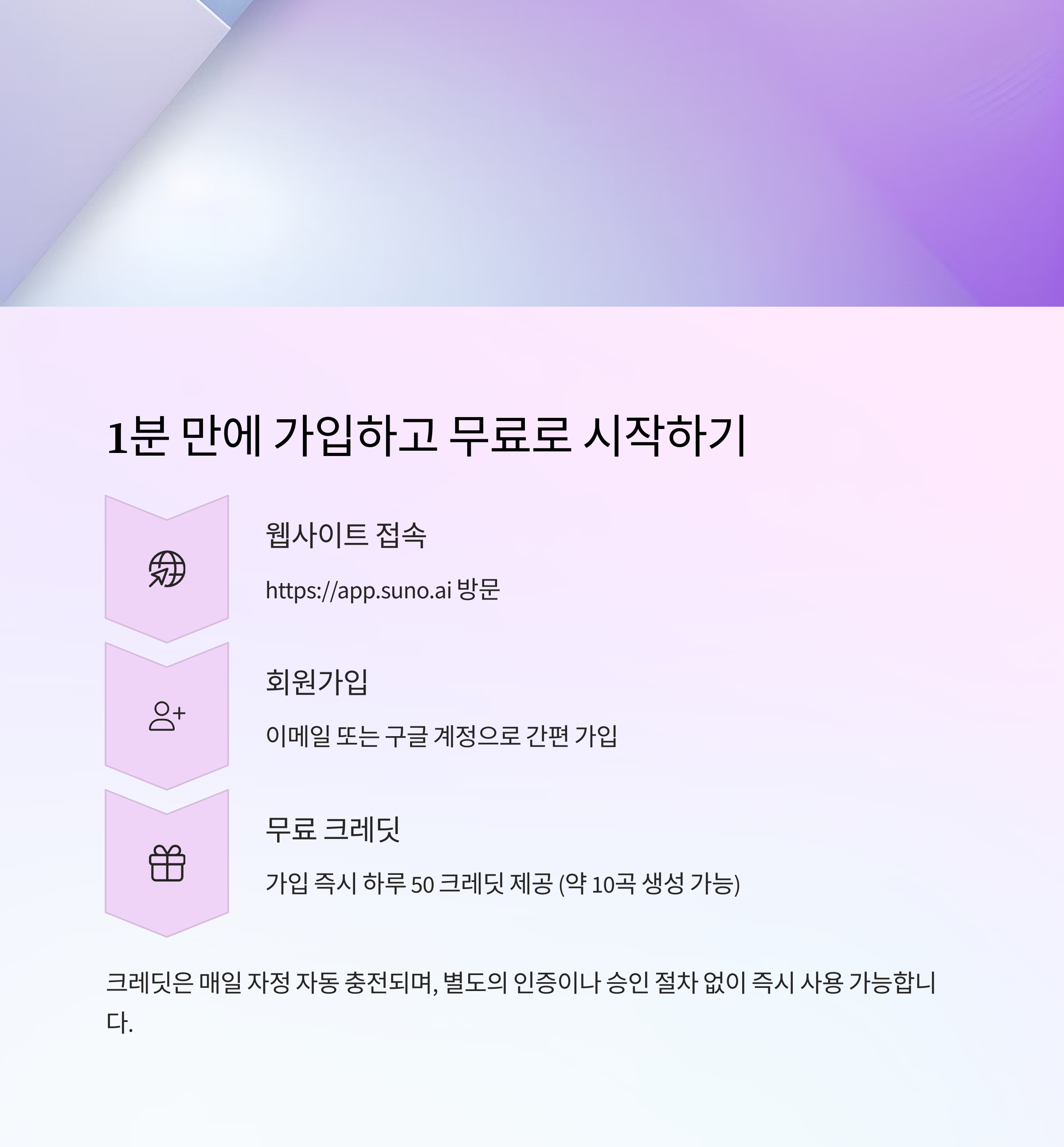 크레딧은 매일 자정 자동 충전되며, 무료로 약 10곡 생성 가능합니다.