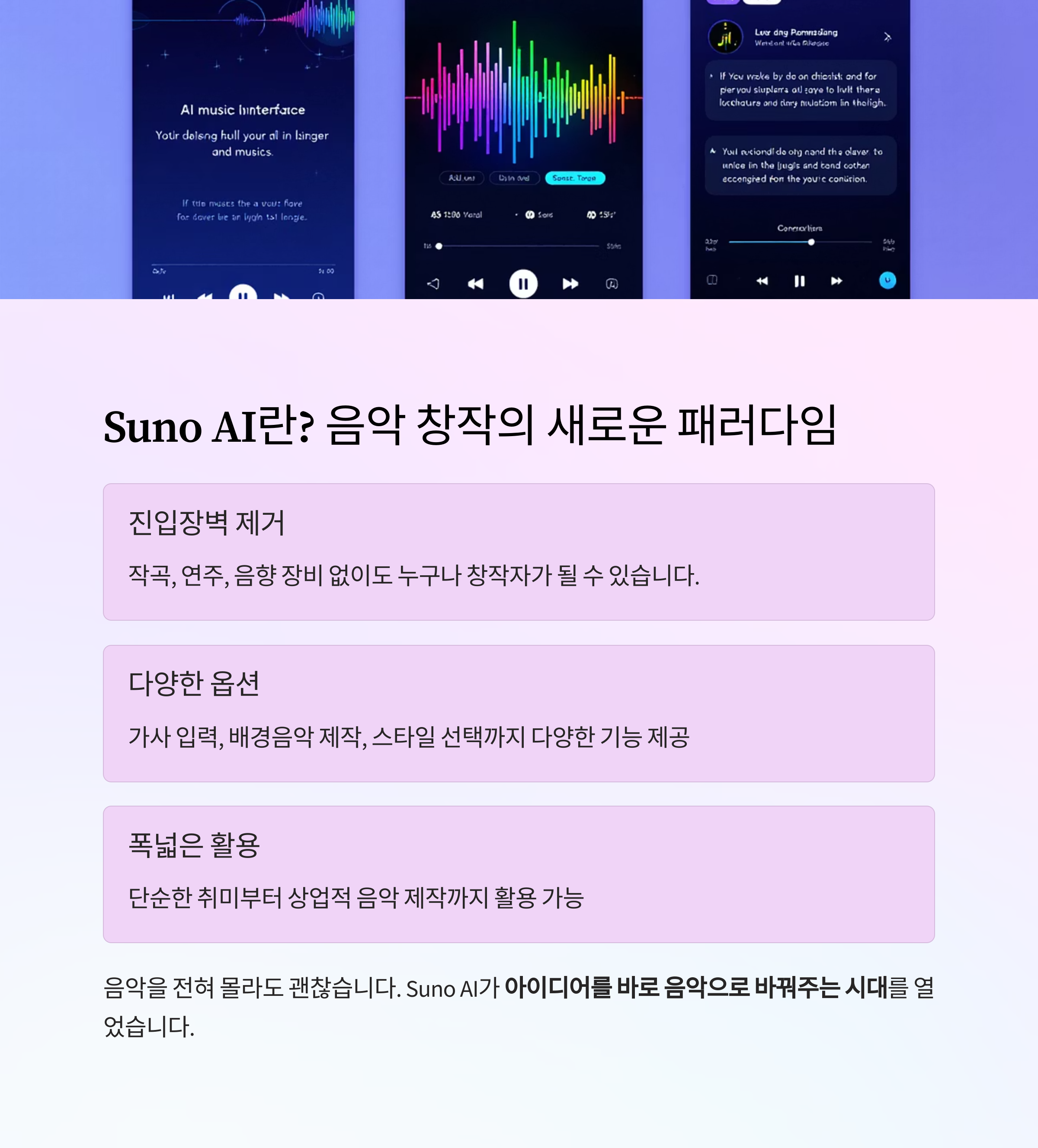 "Suno AI는 음악 제작에 대한 진입 장벽을 완전히 허문 AI 음악 생성 플랫폼입니다."