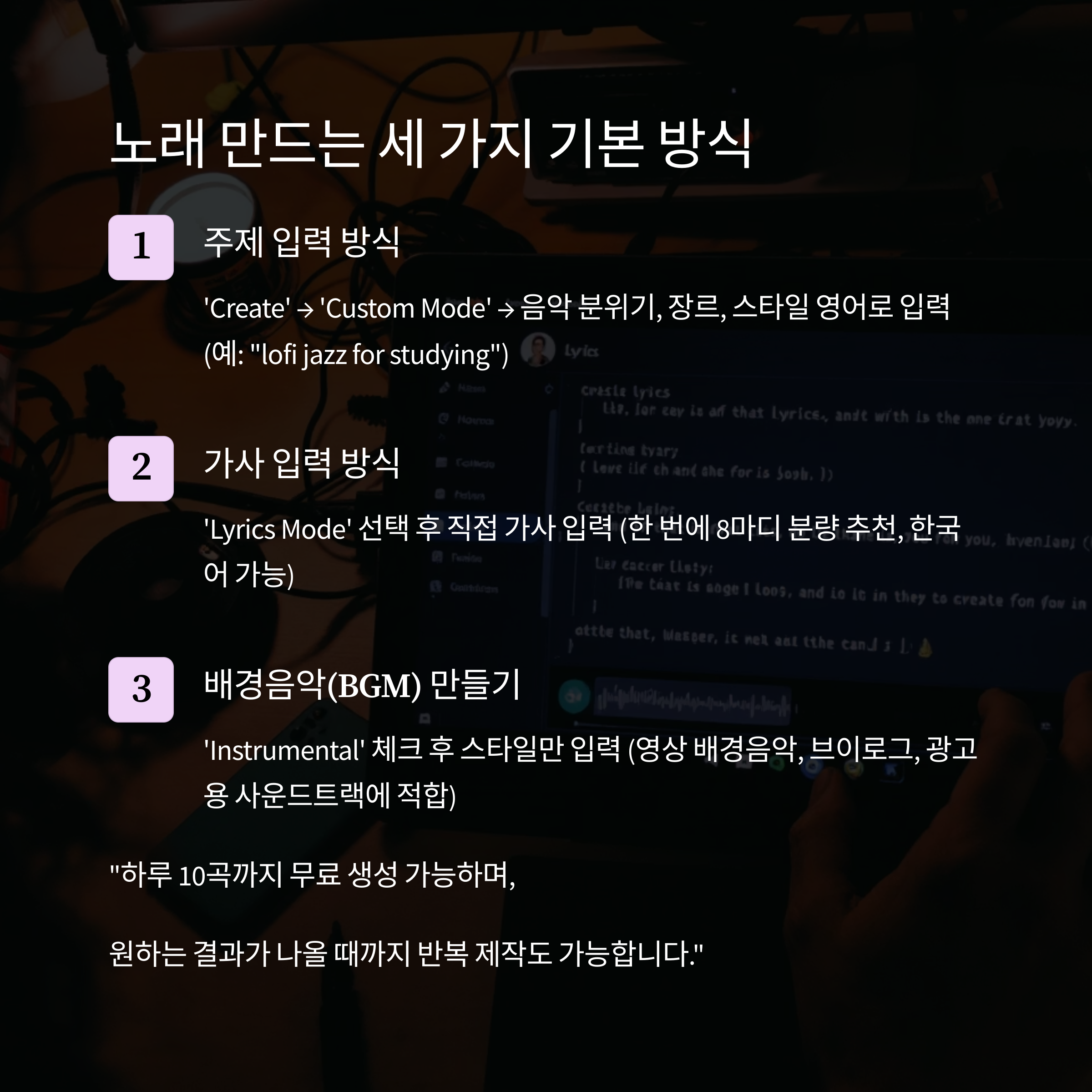 "하루 10곡까지 무료 생성 가능하며, 원하는 결과가 나올 때까지 반복 제작도 가능합니다."