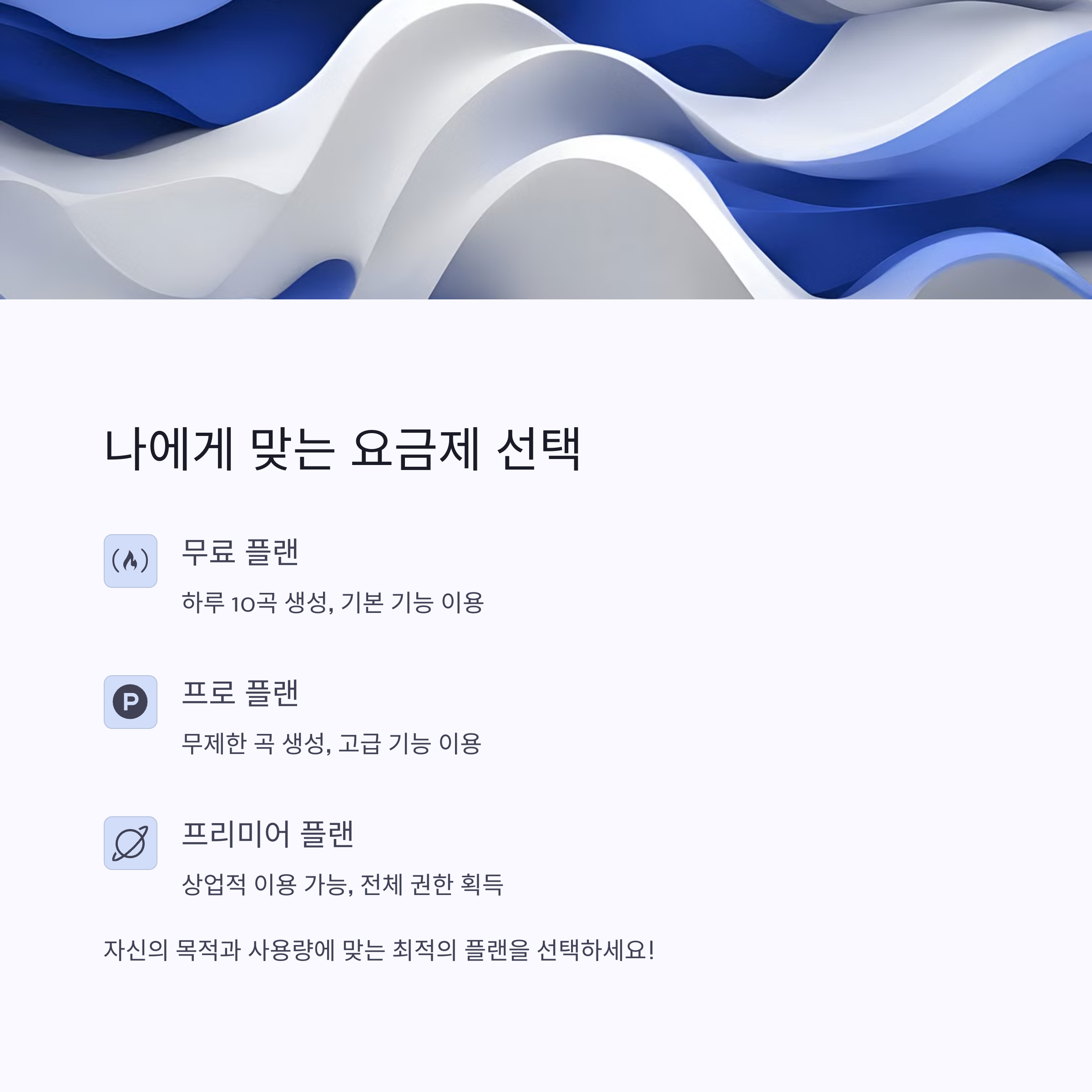 - 무료 플랜 (Basic): 하루 50 크레디트, 10곡까지 생성, 상업적 사용 불가