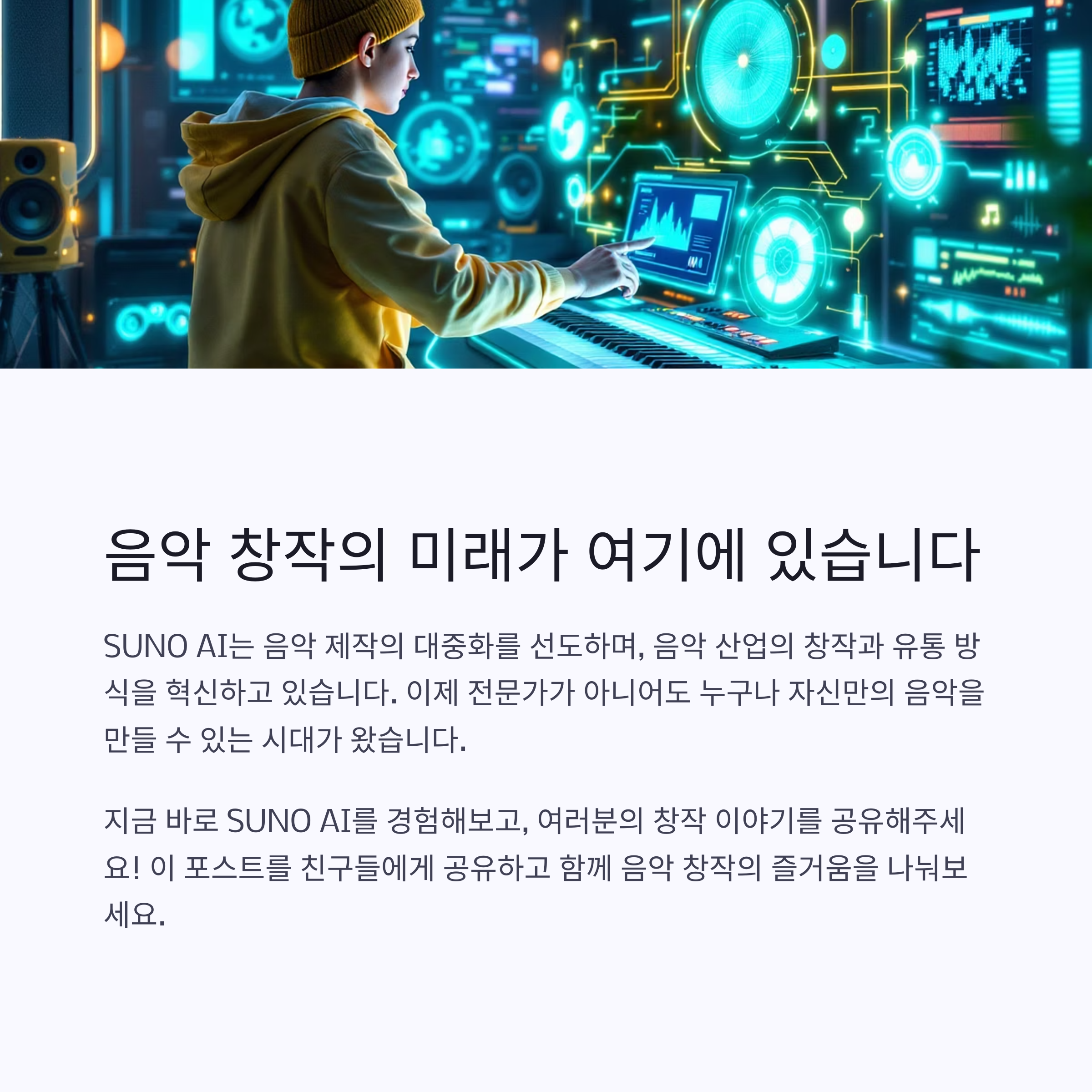 2025년 현재 1,200만 명 이상이 SUNO AI를 이용 중입니다. 누구나 쉽게 음악을 만들 수 있게 되면서, 음악 제작의 대중화가 현실이 되었습니다. 향후 더욱 정교한 커스터마이징과 실시간 협업 기능까지 탑재된다면 SUNO는 단순 툴을 넘어 음악 생태계를 변화시키는 플랫폼이 될 것입니다.