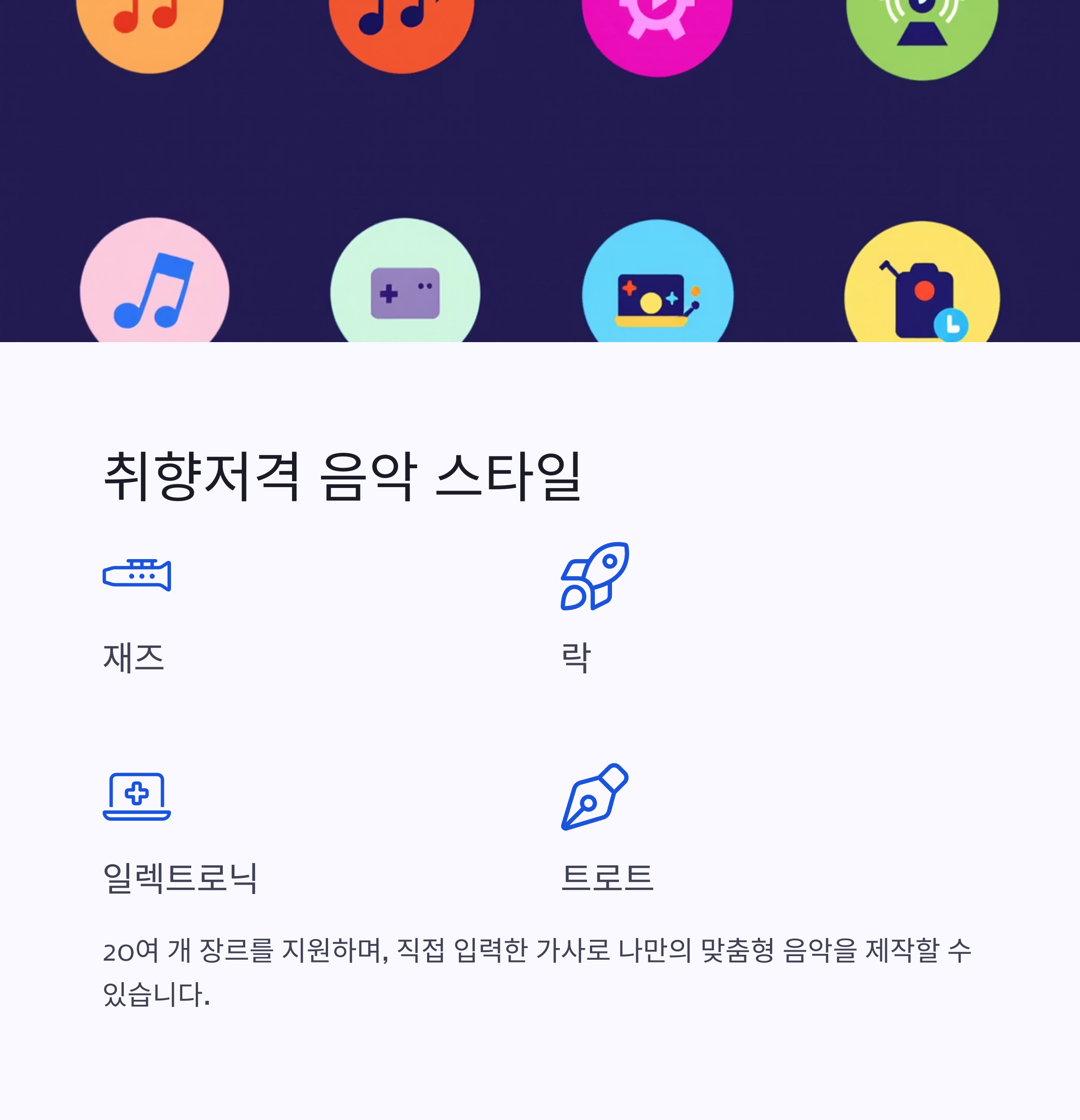 팝, 재즈, 록, 클래식 등 다양한 장르 선택이 가능하고, 개인의 취향에 맞게 템포, 키, 악기 구성을 직접 설정할 수 있습니다. 가사도 자유롭게 입력 가능해 창작의 자유도를 높여줍니다.